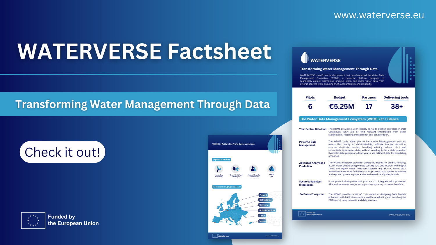 WATERVERSE is an EU-funded project aimed at developing a Water Data Management Ecosystem (WDME) for making data management practices and resources in the water sector accessible, affordable, secure, fair, and easy to use.